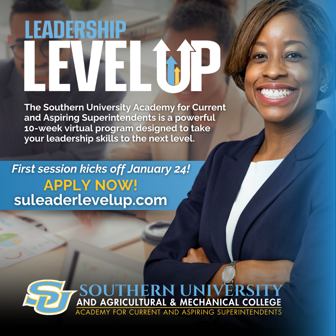 Applications for the Southern University Academy for Current and Aspiring Superintendents are open, and tuition payment options are available. Educators nationwide looking to advance their leadership capabilities and make a meaningful impact in public education are encouraged to apply.